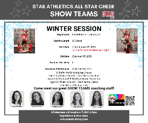 STAR Athletics SHOW: Our Recreational All Star Cheer Performance Program is perfect for beginners and multi-activity kids who want to have fun without competition. No experience needed! Show Teams learn full cheer routines including motions, jumps, tumbling, stunts, and dance—building skills in a fun, supportive, performance-focused environment.